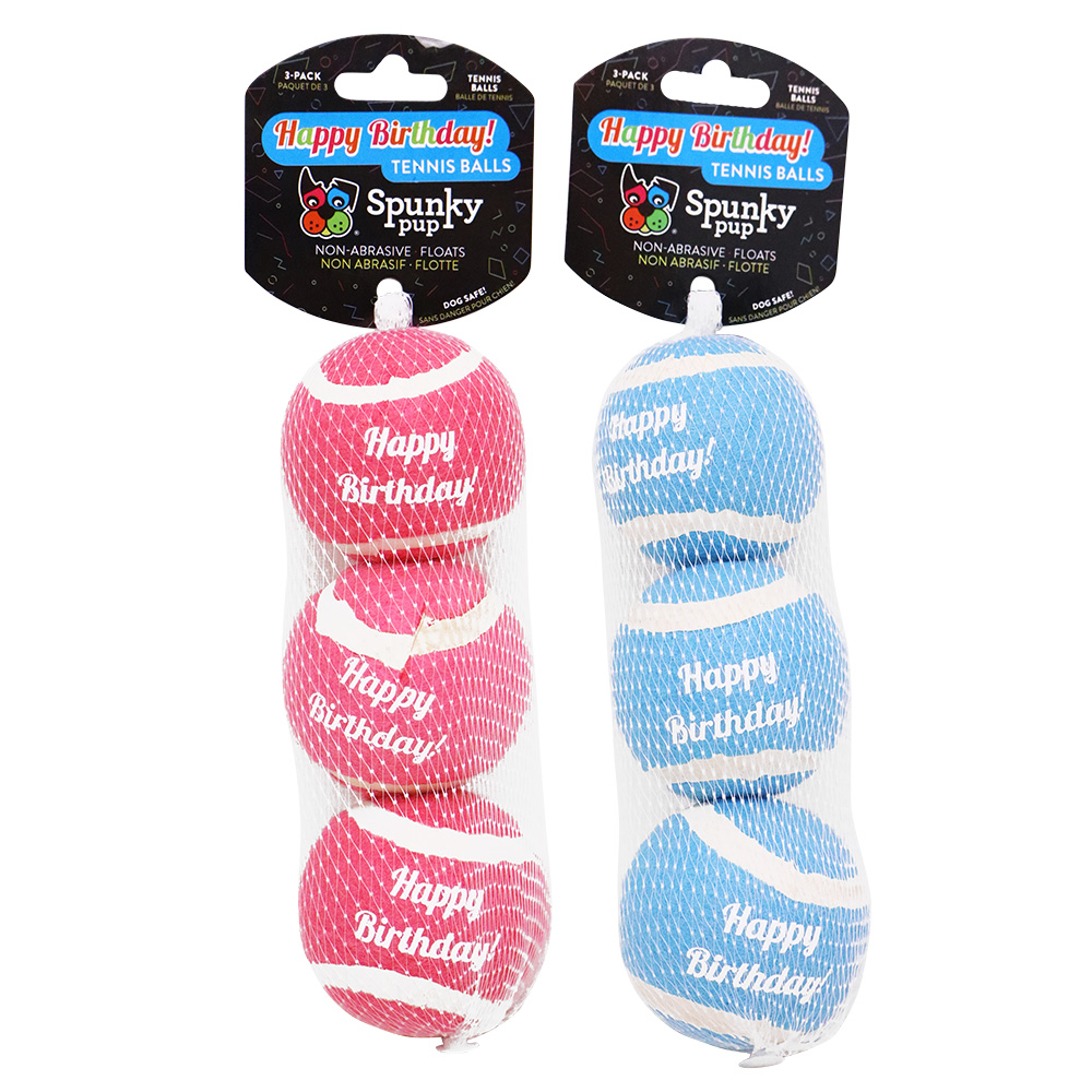 Assortment includes pink and blue tennis balls with “Happy Birthday” quote