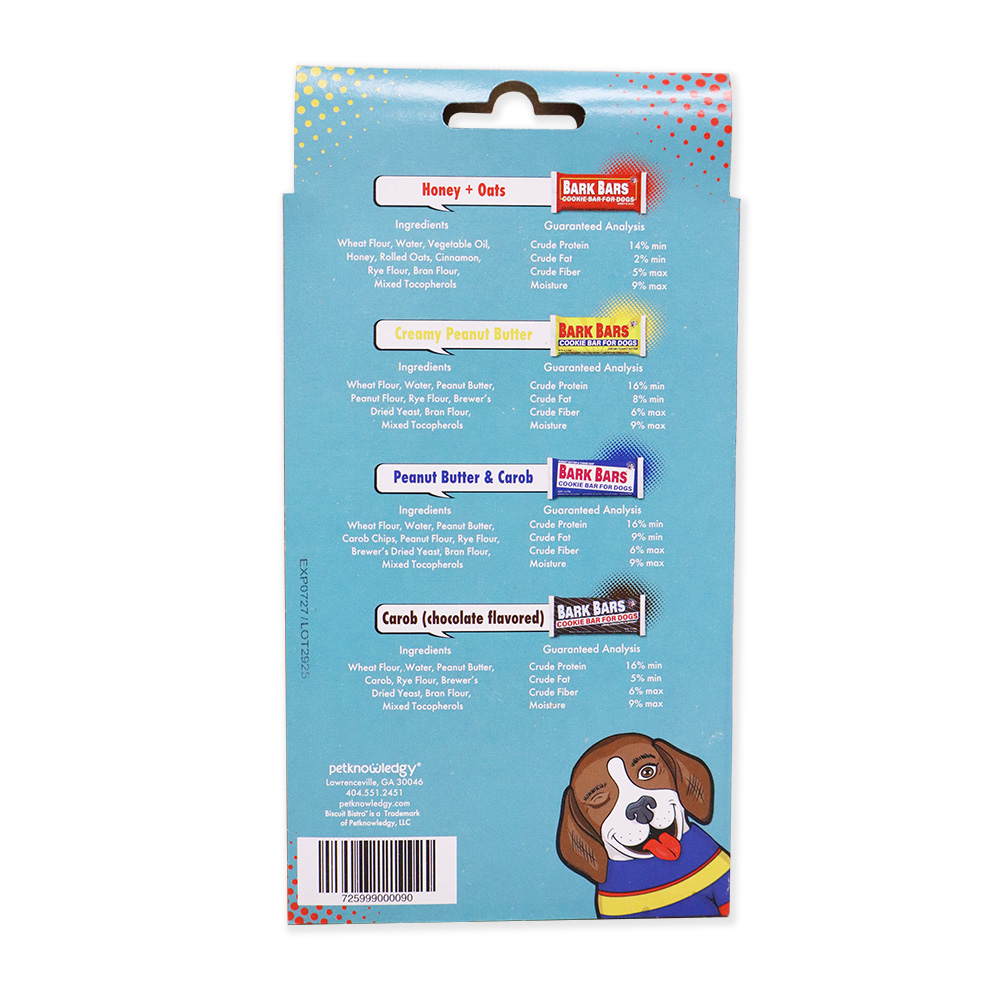 Flavors include honey & oats, creamy peanut butter, peanut butter & carob, and carob (chocolate flavored) *Contains no chocolate